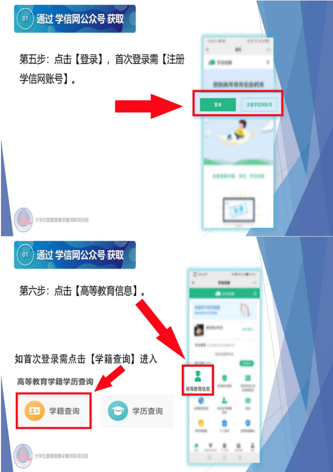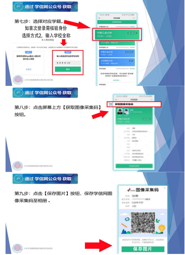 根据教育部相关要求,学信网为每个学生提供专属加密的二维码(图像采集码),学生须至少提前3天登录学信网获取采集二维码,获取方式见下图。