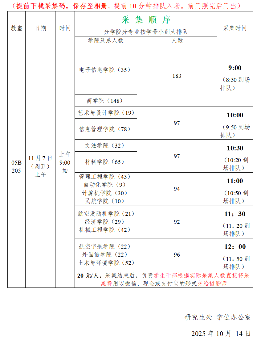 (3)信息采集时间内仍有正常教学活动,请各学院负责人务必切实负好责任,组织好自己学院的毕业生,不要大声喧哗,不要将垃圾留在教室,从正门进,采集完毕后迅速从后门离开,不要在场馆内过多停留,暂时没有轮到次序的学院和班级请在教室外排队等待。