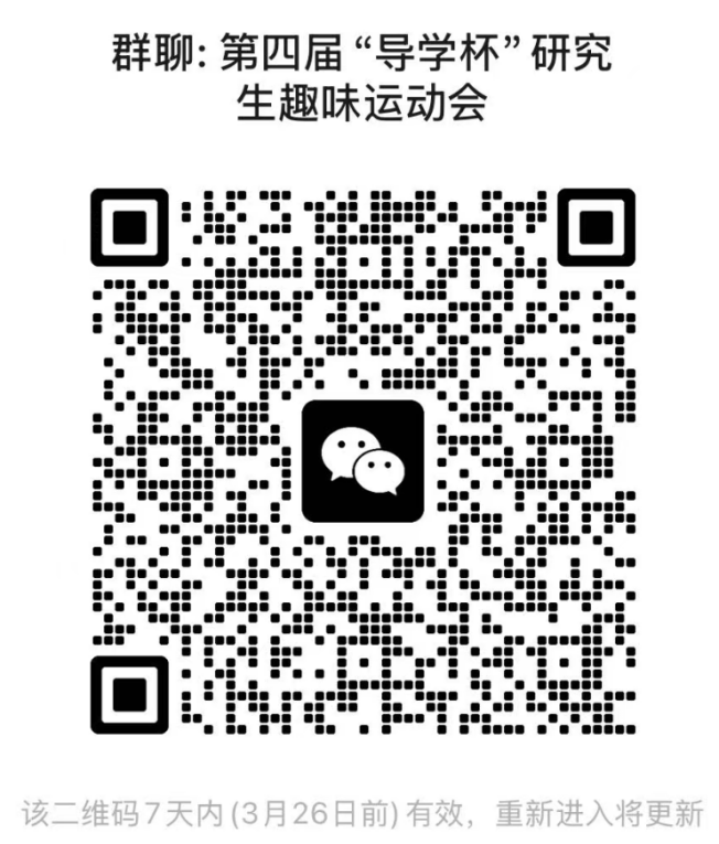 5.比赛微信群:各学院参赛队员需在报名截止前加入“第四届“导学杯”研究生趣味运动会”微信群,负责后续事宜的沟通与联系。