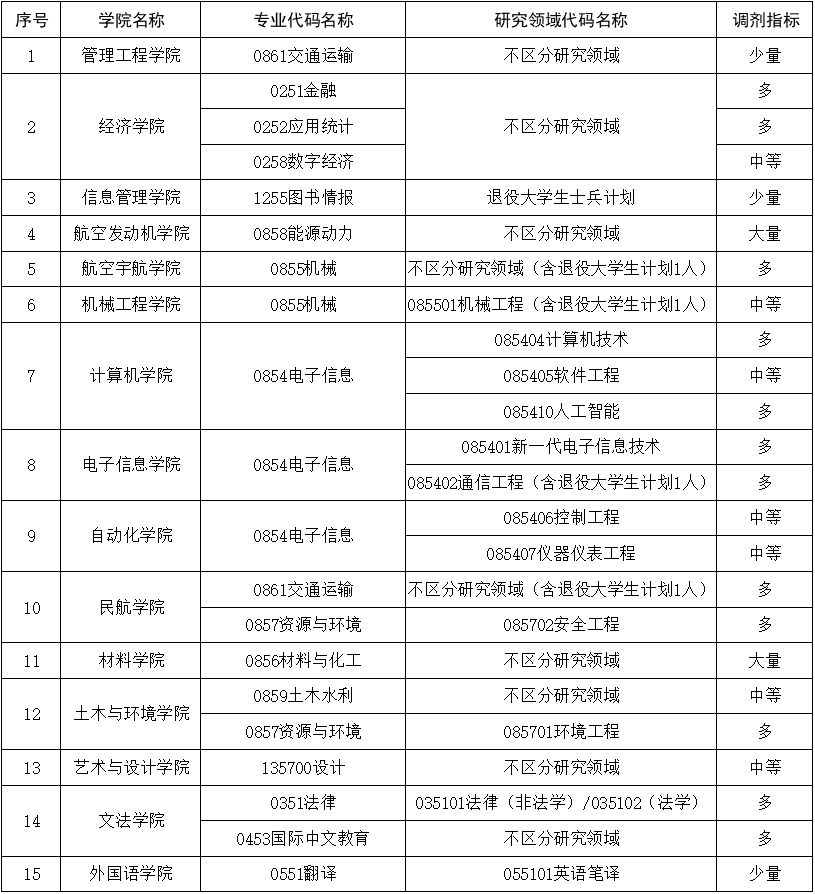 说明:“调剂指标”栏中,“少量”指调剂名额<5;“中等”指5≤调剂名额<10;“多”指10≤调剂名额<20;“大量”指调剂名额≥20。个别招生专业指标后期可能微调。