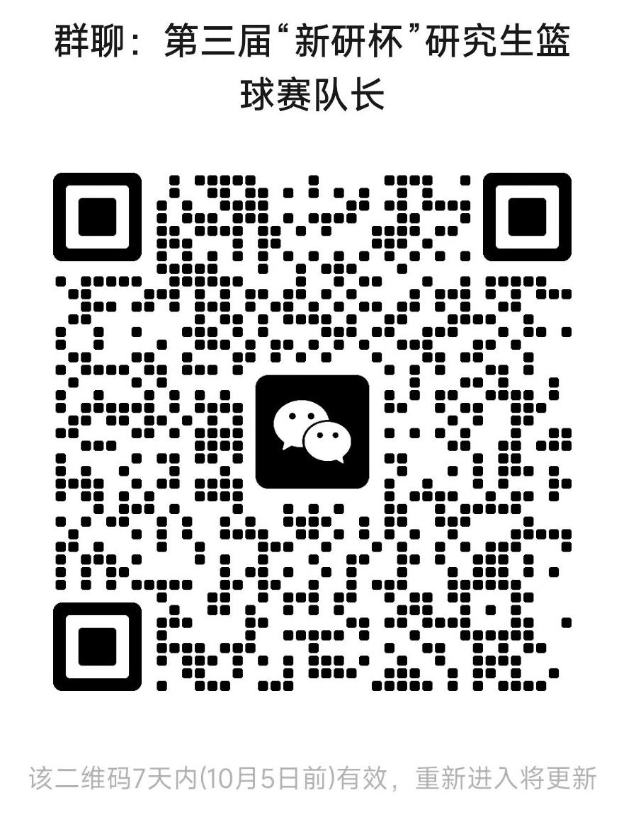 (1)比赛微信群:各参赛队长(男篮、女篮队长)需在报名截止前加入“第三届“新‘研’杯”研究生篮球赛队长”微信群,负责后续事宜的沟通与联系。
