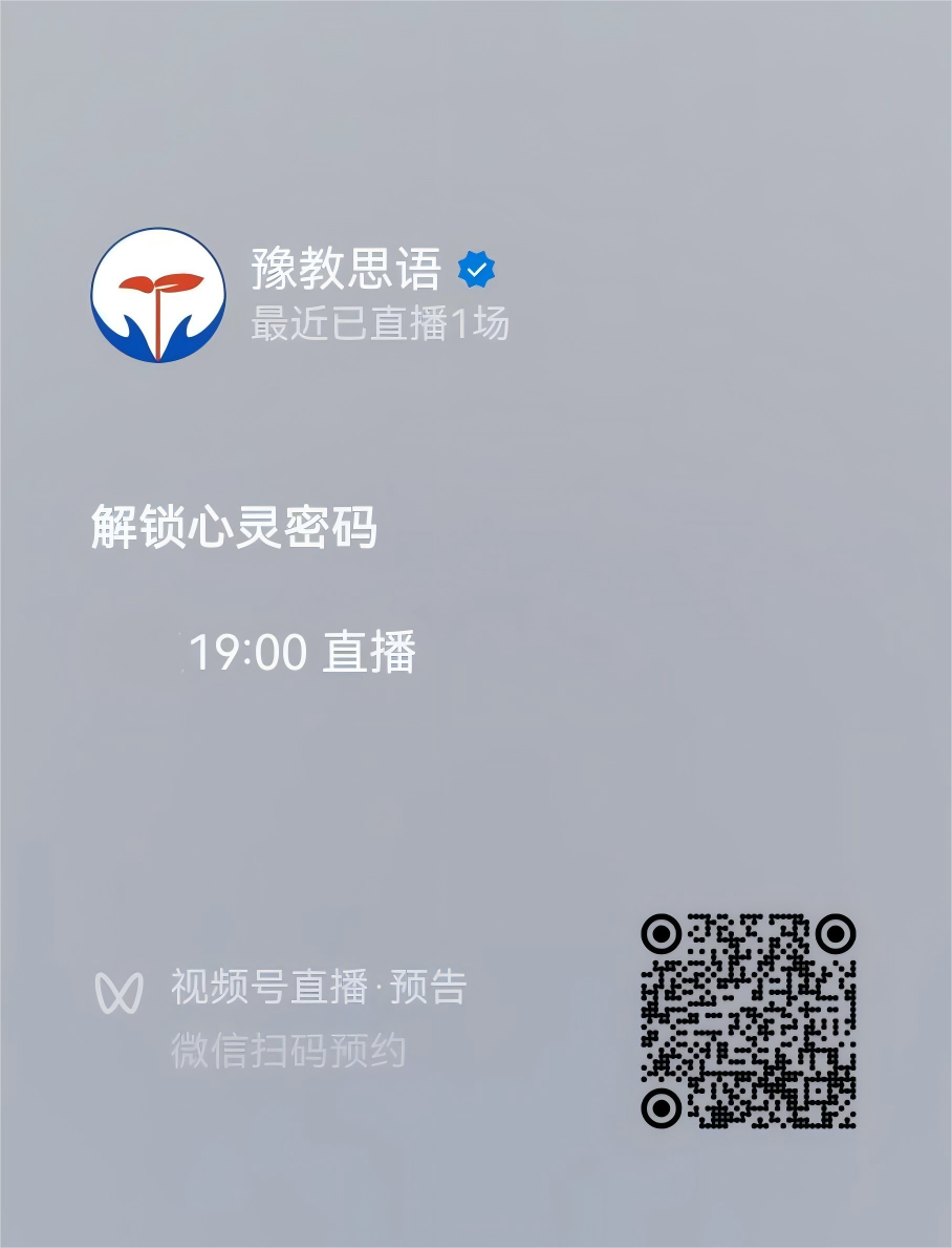 扫码关注“豫教思语”视频号,点击屏幕上“预约”待直播开始即可观看。
