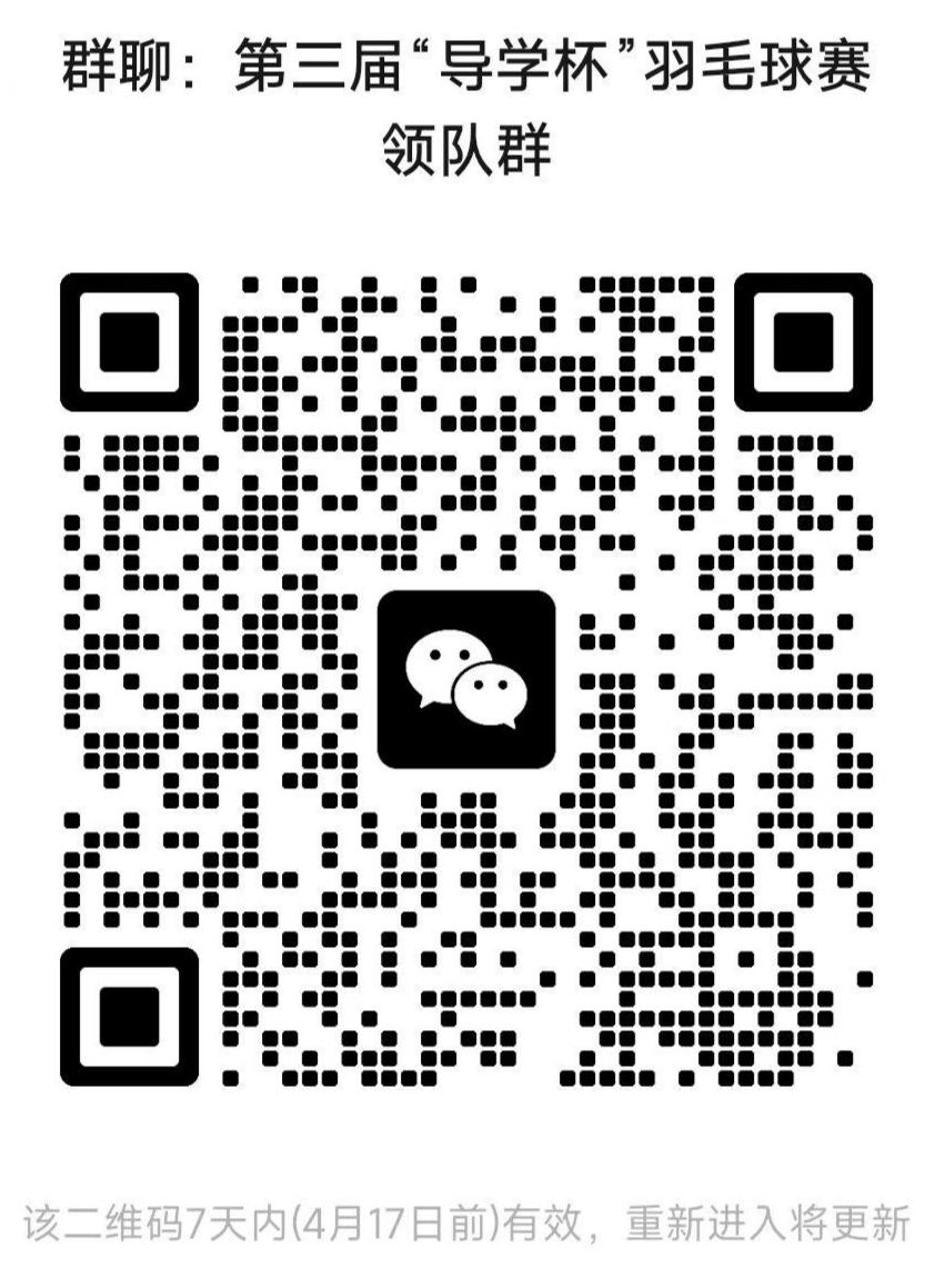 (1)比赛微信群:各参赛学院领队需在报名截止前加入“第三届‘导学杯’羽毛球赛领队”微信群,负责后续事宜的沟通与联系。