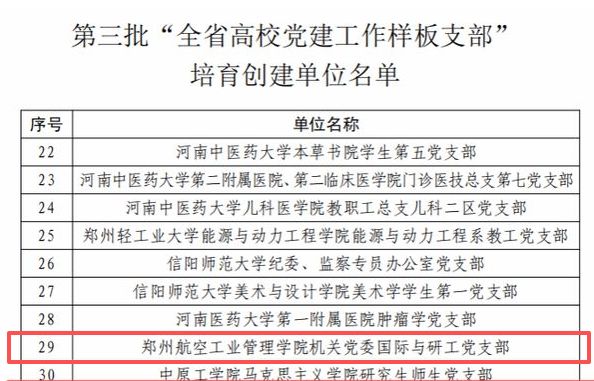 近日,中共河南省委教育工委公布了第三批全省高校党建“三级联创”评选结果,国际与研工党支部成功入选“全省高校党建工作样板支部”培育创建单位。此次入选,是对国际与研工党支部党建工作的充分认可,也标志着支部建设工作迈上了新台阶。