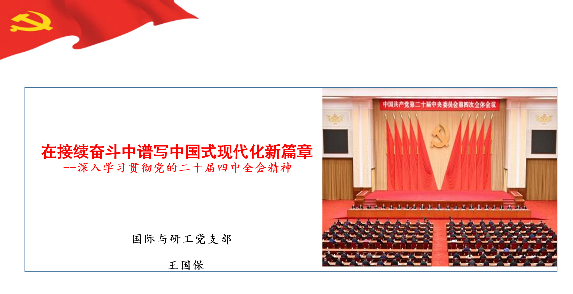为深入学习贯彻党的二十届四中全会精神,12月5日,国际与研工党支部组织召开12月份政治理论学习会议,党支部书记王国保以《学习贯彻党的二十届四中全会精神,奋力开创中国式现代化教育新篇章》为题,为全体党员讲授专题党课。